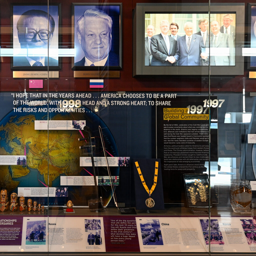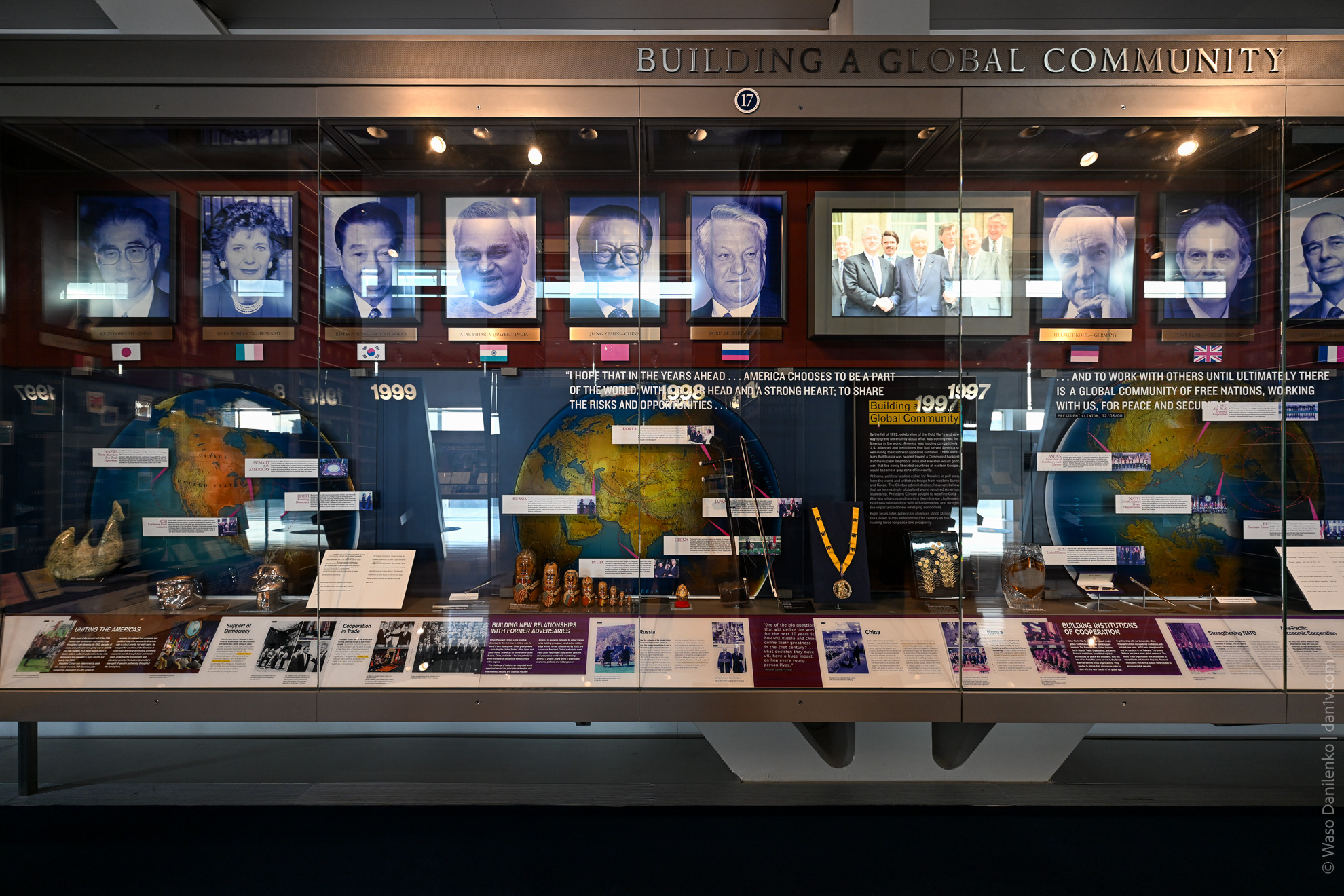 Фотография и фрагмент видео с Борисом Николаевичем Ельциным находятся в разделе Building a Global Community («Создавая глобальное сообщество»), где рассказывается про поддержку демократий по всему миру и выстраивание отношений с бывшими противниками.