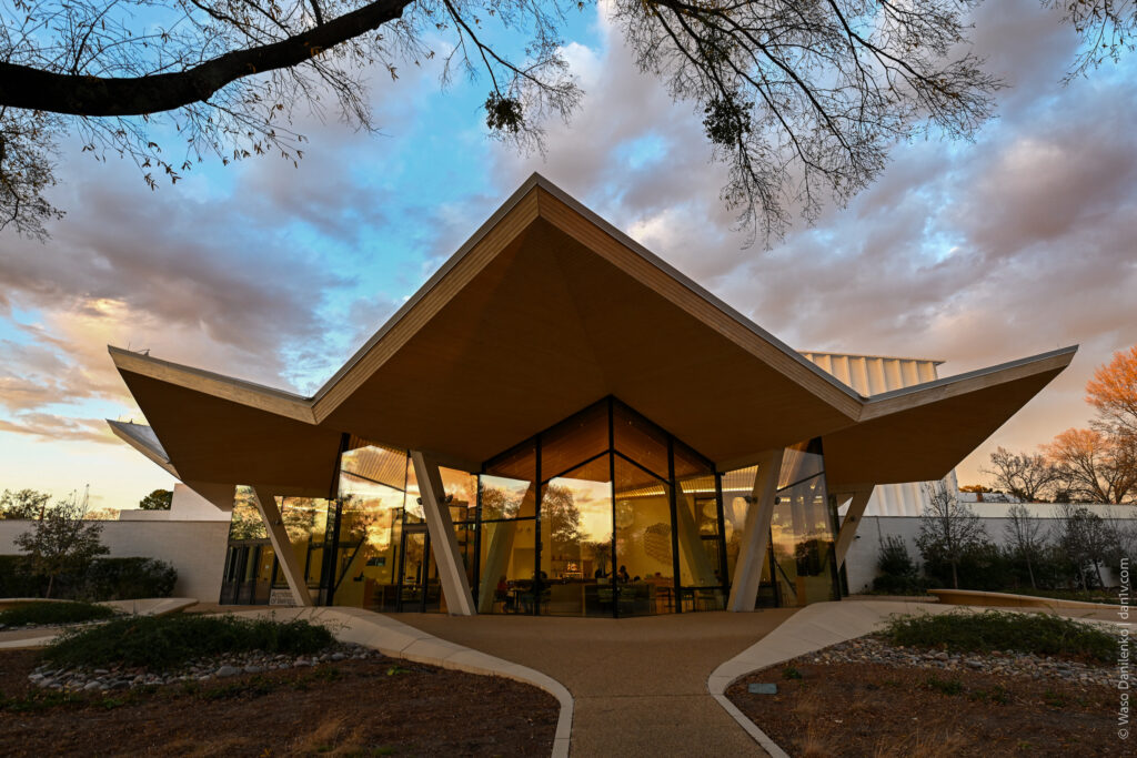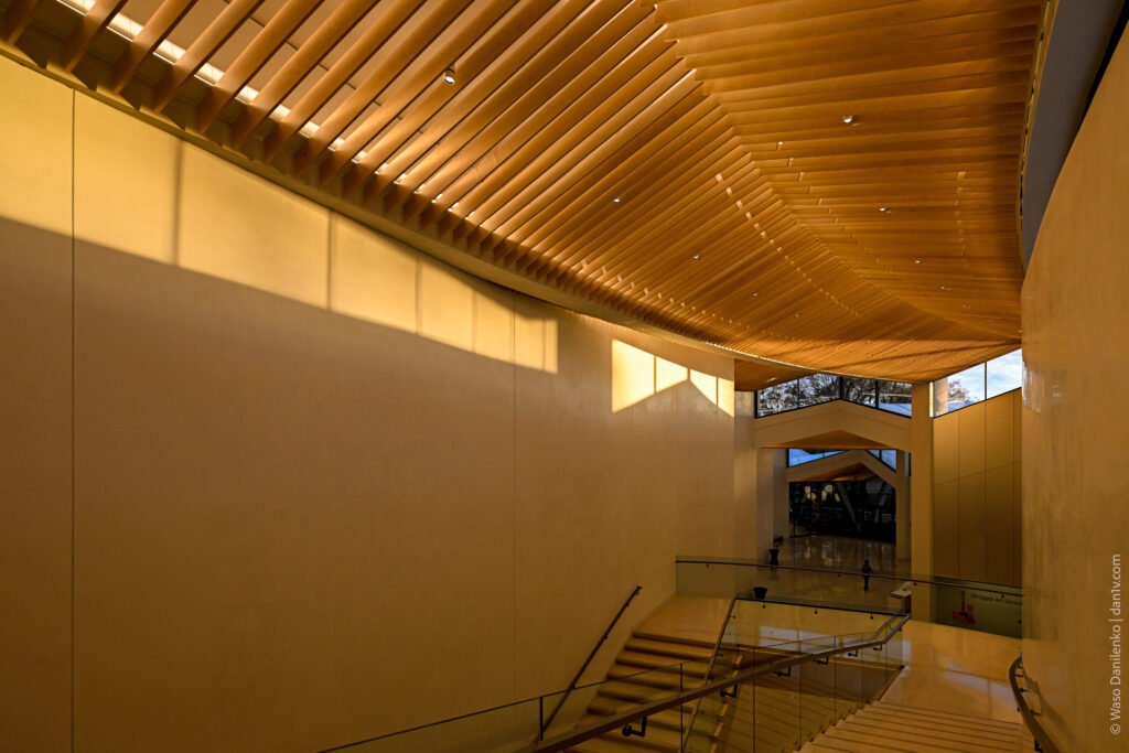 Ее главный прием — открытость и прозрачность за счет плиссированной бетонной крыши (folded plate concrete roof). Она «складывается» как ткань, открываясь наружу с обеих сторон — к городу и к парку. Более того, большие стеклянные плоскости буквально втягивают парк внутрь музея.