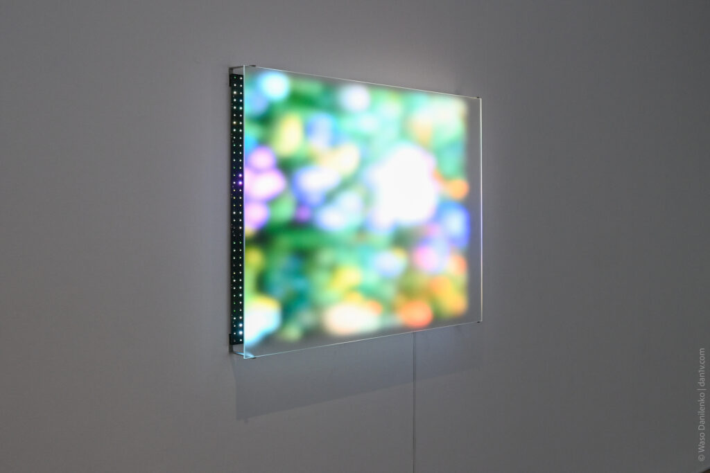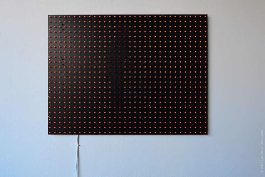 Мне невероятно понравились работы Джима — они представляют собой LED-панели низкого разрешения. Иногда это буквально 165 лампочек на всю площадь. С близкого расстояния видишь только как эти лампочки медленно загораются и гаснут, создавая какие-то абстрактные цветовые пятна. Но стоит отойти назад — и мозг внезапно собирает из этого шума идущего человека или морскую волну.