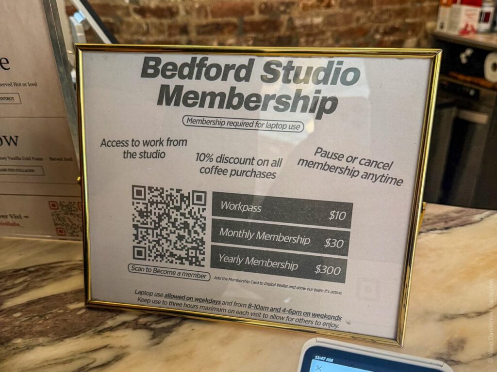 А теперь новый тренд — в кофейне можно сидеть с ноутбуком, если ты… купишь абонемент или оформишь подписку. На фотографии прайсинг кофейни Bedford Studio в районе West Village: