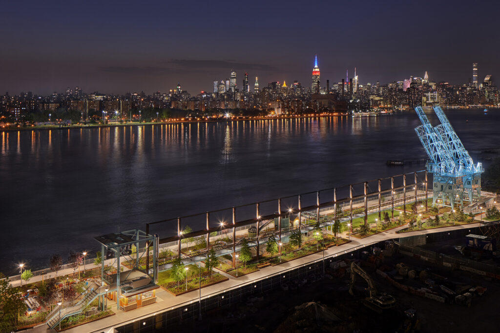 Отсюда открывается вид на нижний Манхэттен, Вильямсбургский мост и движение судов по Ист-Ривер. На закате небоскребы напротив светятся золотым.