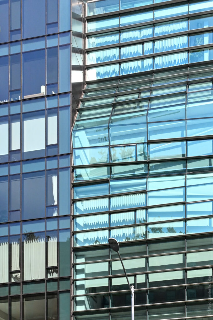 Вместо традиционной вертикальной плоскости фасад стал диагональной складкой, создающей разные перспективы для каждой квартиры. На уровне улицы фасад слегка вогнут, формируя, как говорят архитекторы, «приглашающий» вход.