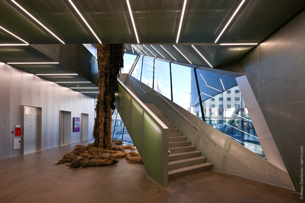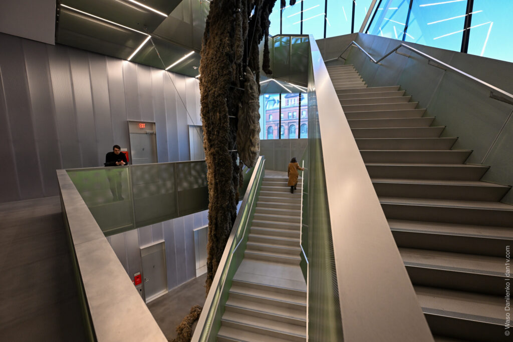 К сожалению, открытая терраса на седьмом этаже и другие пока еще закрыты до начала летнего сезона, так что наслаждаться видом города можно только через стекло. Все этажи соединяет невероятная лестница-атриум и это, пожалуй, главное архитектурное впечатление от нового здания-дополнения бюро OMA.
