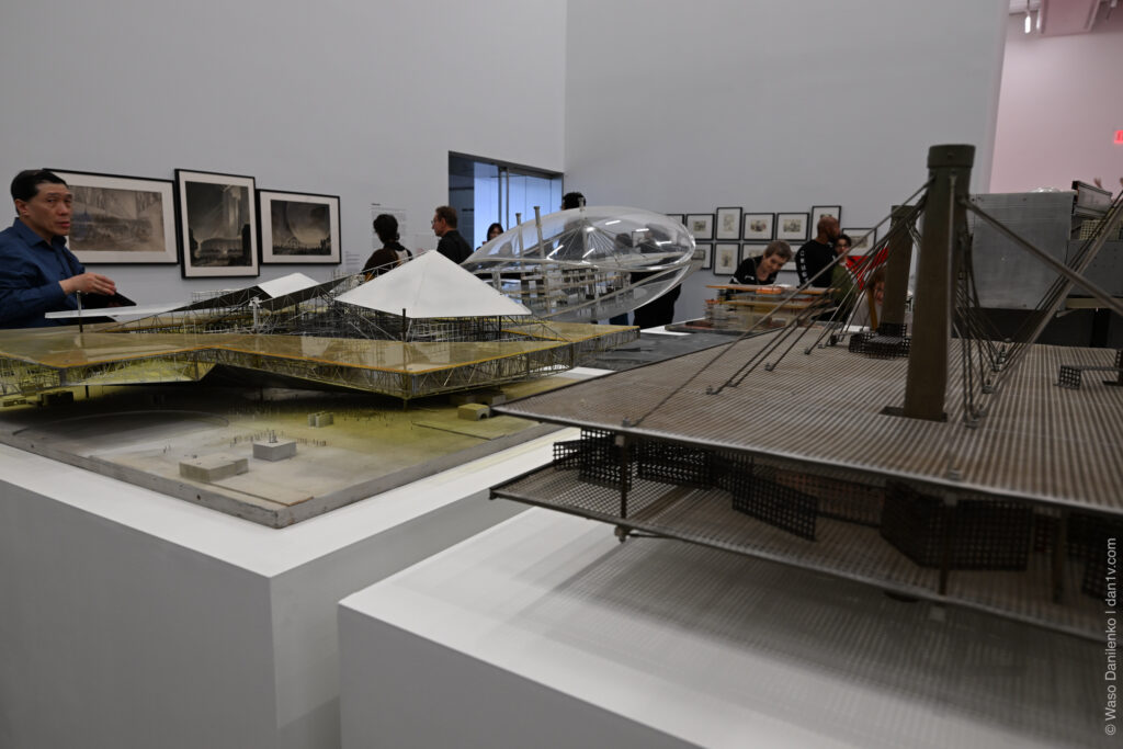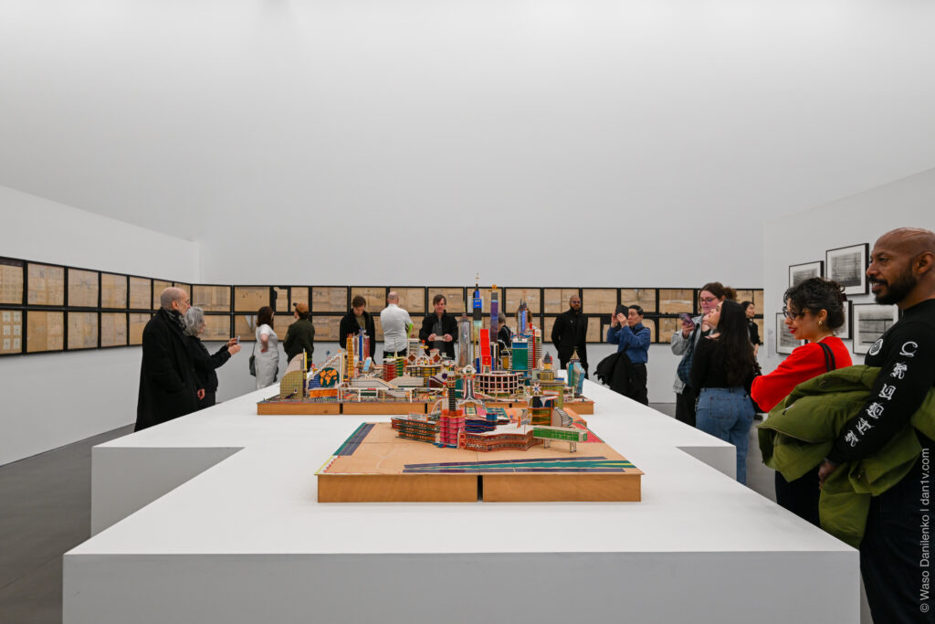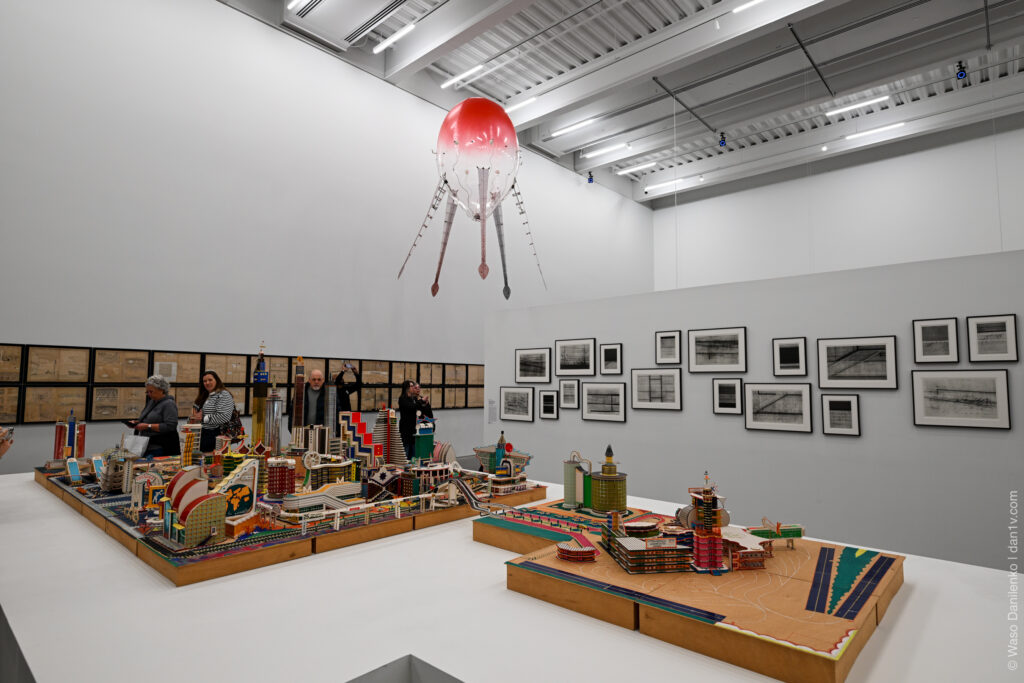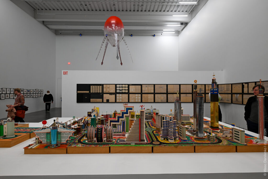 4 этаж — мой любимый, это «Города будущего» с летающими существами. Художница Аника Йи запустила дроны-медузы, парящие над фантастическими городами-макетами Бодиса Исека Кингелеза — как саркастическая отсылка к фильму «Война Миров».