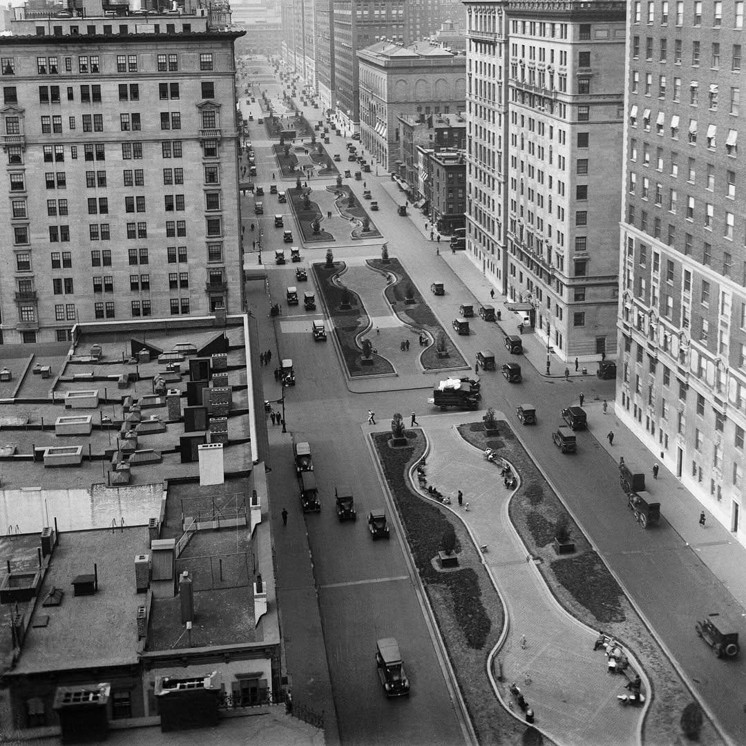 На снимке видно новую пешеходную зону на Park Avenue, которую как раз переустроили в 1923–1924 годах после того, как железнодорожные пути Нью-Йорк Центральной железной дороги накрыли бетонной плитой.