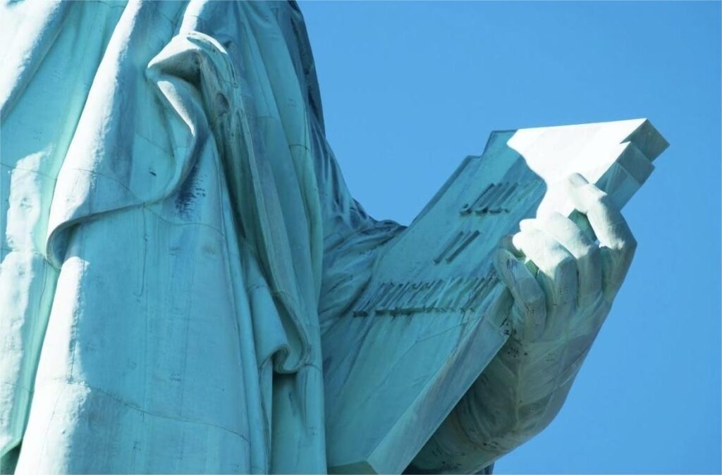 В левой руке статуя держит законодательную скрижаль (tabula ansata). На ней высечена дата принятия Декларации независимости США — «JULY IV MDCCLXXVI» (4 июля 1776 года), что подчеркивает верховенство закона и торжество независимости.