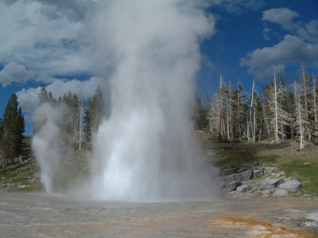 - Гейзер Олд Фэйтфул («Старый служака») извергается каждые 44–125 минут и выбрасывает от 14,000 до 32,000 литров кипятка на высоту до 55 метров на протяжении 150 лет наблюдений.